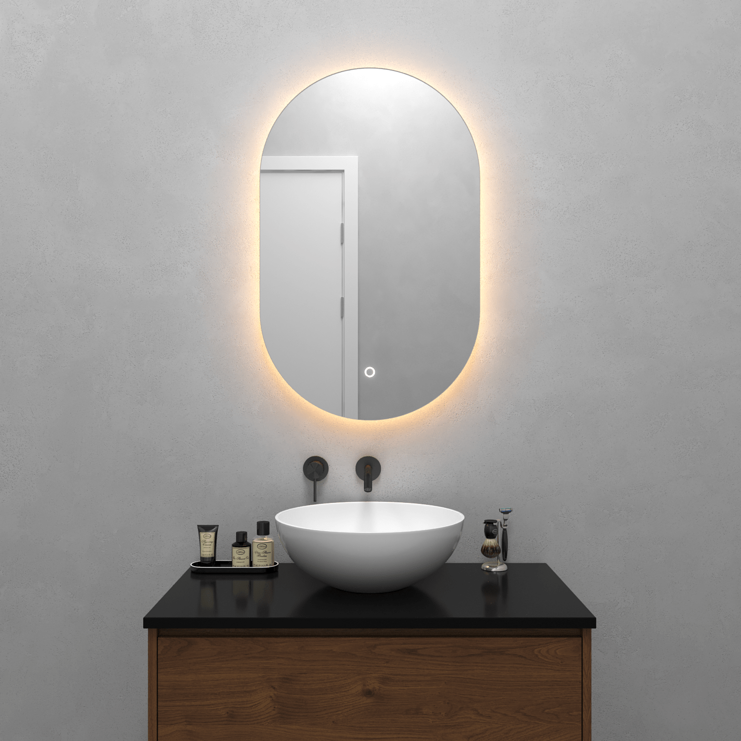 Безрамное зеркало овальной (капсульной) формы с контурной (тыльной) тёплой подсветкой, свет 3000К.