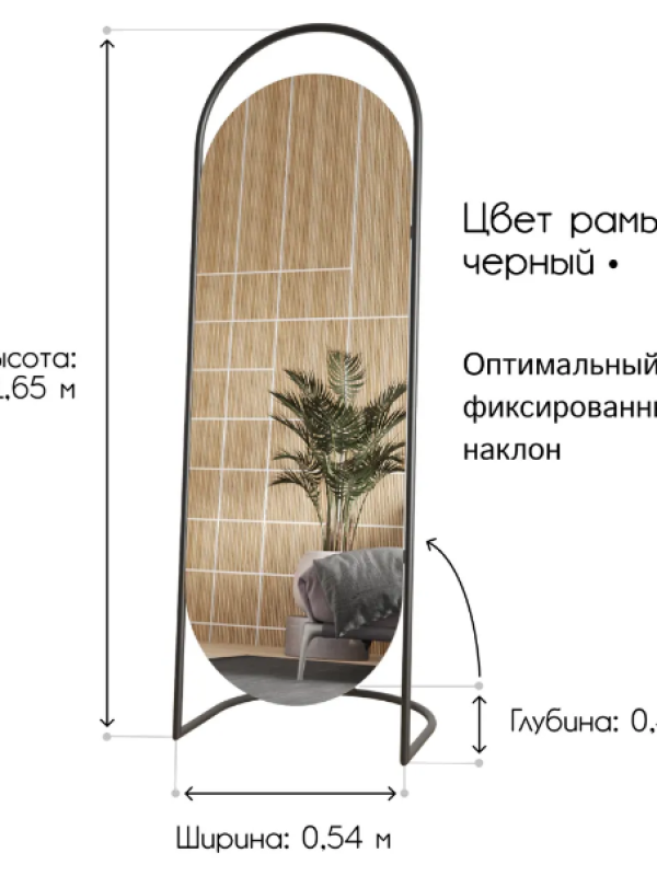 Зеркало «Queen». Артикул GMZ-01-1/2/3 Дизайнерское напольное зеркало в полный рост в металлической овальной раме ручной работы выполнено в минималистичном стиле. Простая изысканность форм и современный дизайн делает его уместным практически в любом интерьере. Оно может быть установлено в спальне, прихожей, гостиной, где за счёт своих внушительных размеров способно расширить пространство и создать иллюзию источника освещения. Зеркальное полотно изготовлено известным бельгийским производителем AGC и воплощает в себе старинные европейские традиции в совокупности с новейшими технологиями изготовления стекла. Наклон зеркала оптимальный фиксированный, что позволяет отражать любой рост.Характеристики:– профиль рамы – труба, диаметром 20 мм; – габариты – 1650х540х400 мм; – размер зеркального полотна – 1350х500 мм, толщина – 4 мм; – вес – 11 кг; – устойчивая двухслойная порошковая окраска; – возможные цвета – золотой, чёрный, белый.